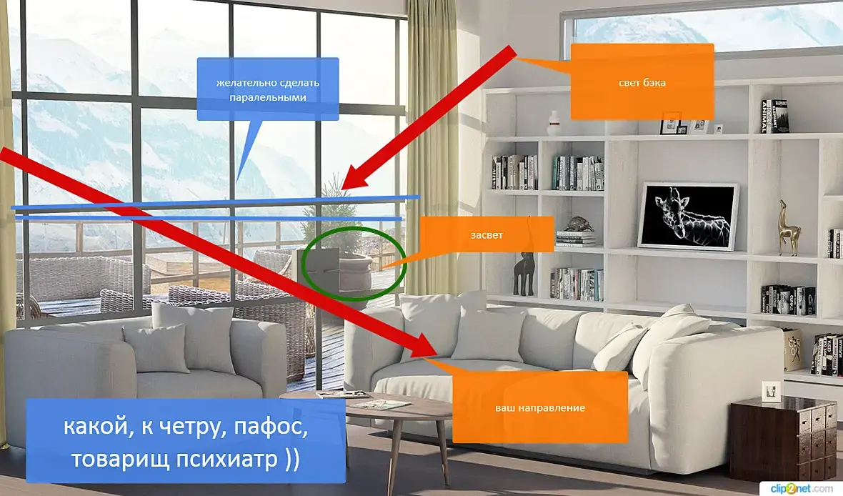 3) Почему бэк не соответствует освящению? За окном светлый день, внутри солнечные лучи и светло. По гамме вроде соответствует. (подробнее в чем конкретно проблема по вашему).