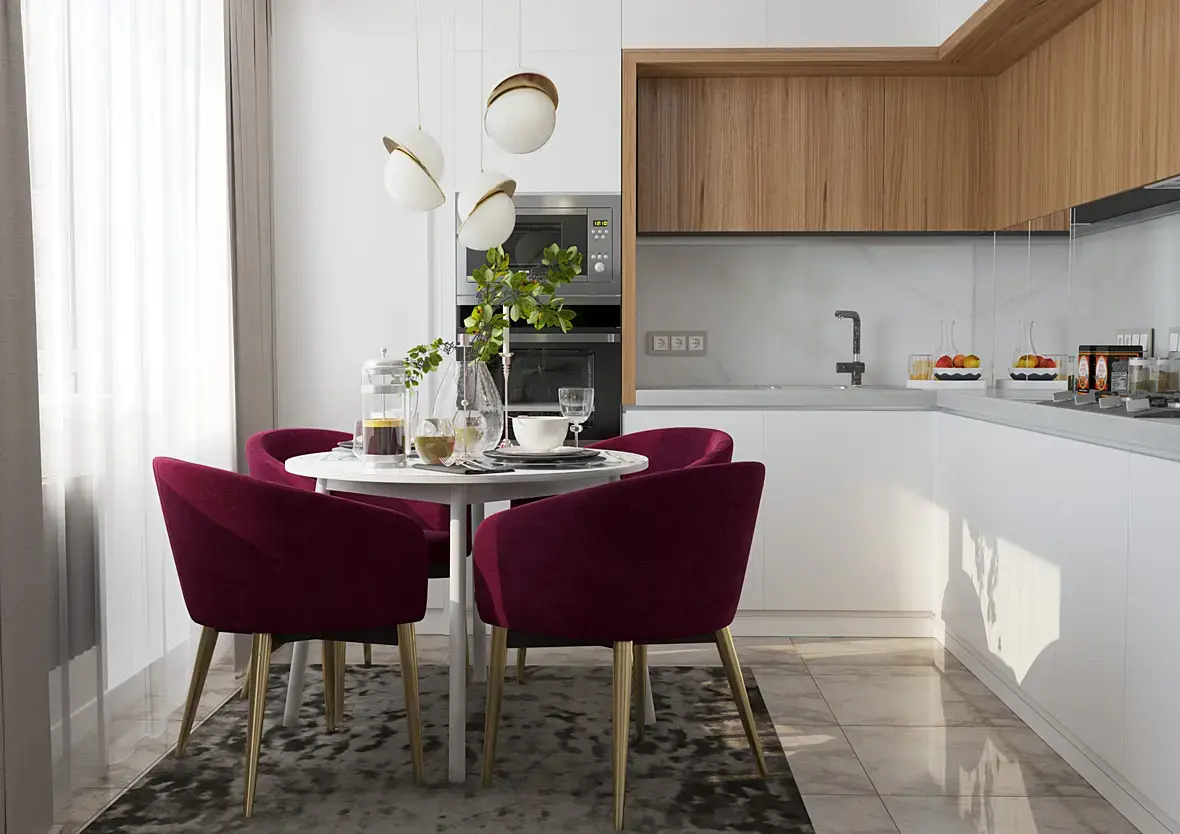 Ломаные спинки кресел прям глаз режут. Я не специалист, может это дизайнер так задумал, но выглядит как косяк групп сглаживания. Контраста не хватает на мой вкус. Непонятно из какого материала приборы, если это металл, то не убедительный, а вилки еще и левитируют над салфеткой. У тарелок тоже края рубленые. Нет стула с той стороны где стоит еда. Может он конечно и есть, но его не видно, поэтому выглядит как будто нет, да и вообще ракурс не очень удачный.