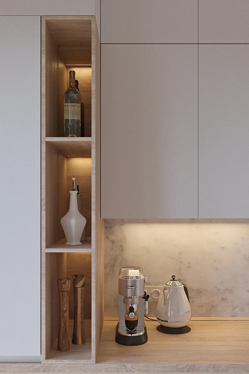 Чамферы на фасадках и столешници, их нет или не видно подсветка фартука на разной высоте, и текстура фартука низкого расширения, размывается.