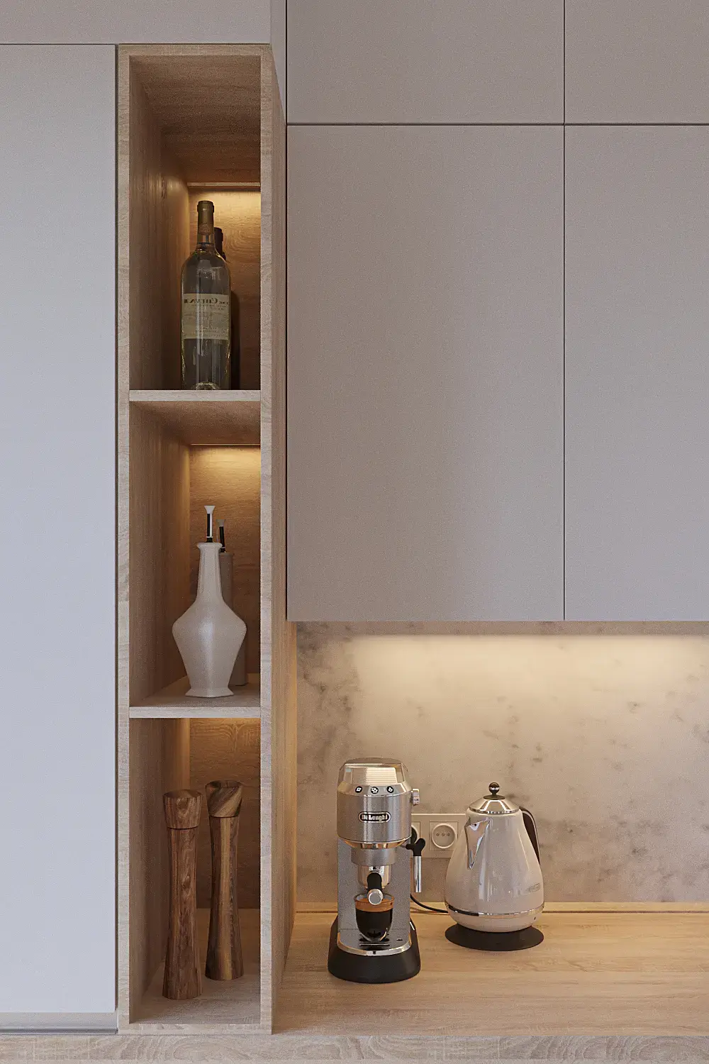 Чамферы на фасадках и столешници, их нет или не видно подсветка фартука на разной высоте, и текстура фартука низкого расширения, размывается.