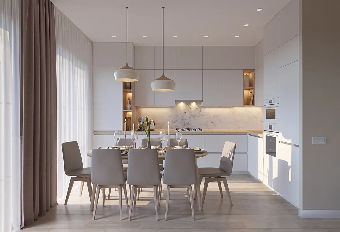 Не помешали бы яркие пятна, акценты. Например стулья бордовые. Фартук из черного закаленного стекла.