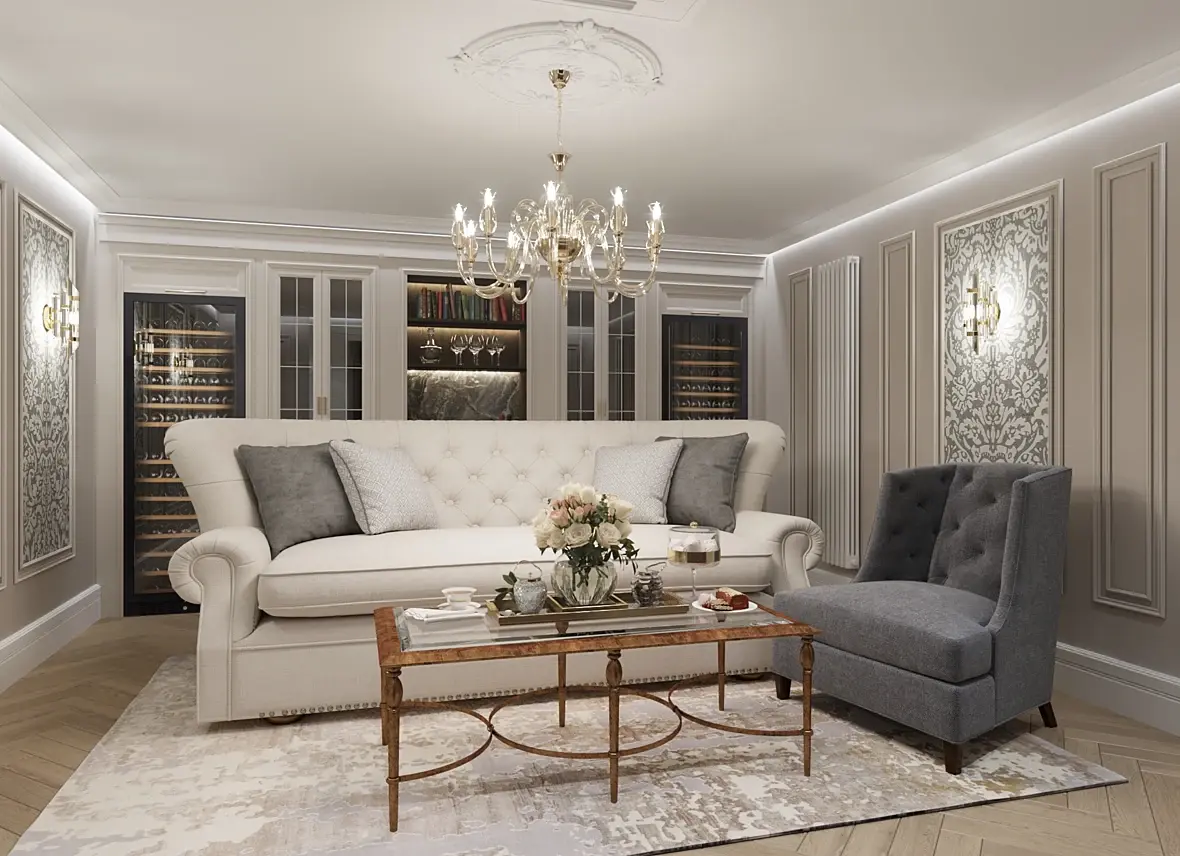 Пропорции мебели явно не соблюдены. Диван и кресло рядом, а высота сидения значительно различаются. Обычная высота 450-500 мм. Высота спинки дивана чуть ли не до середины высоты стен. Сядешь на диван и упрёшься головой в люстру.
