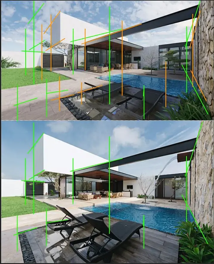 мне не нравится камера, нужно убрать стену справа. за стеной слева добавить деревья для передачи глубины. не нравится материалы: белая штукатурка, плитка, стекло. трава ядрёная. не хватает "грязи" на поверхностях. на пп заменить шезлонги на более детализированные. да и вообще мебель не стильная какая-то) свет скучный. это всё субъективно конечно же) дерзайте