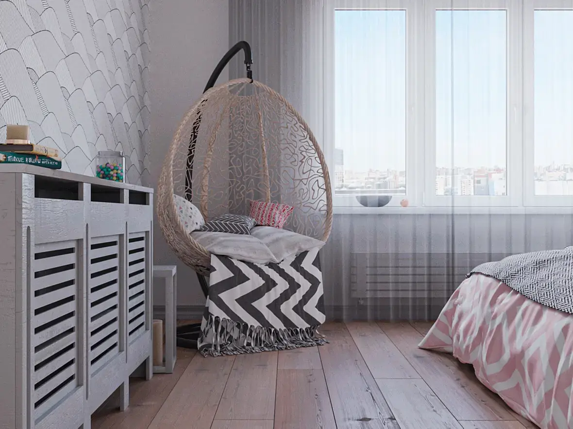 уверен , референсом был не каталожный кадр подвесного кресла, а один кадр из фотографий (надеюсь не рендеров) спальни. Фотограф просто как смог сфоткал это кресло, как поместился. Референс я не видел , но если вы его повторили близко по композиции, то фотограф сработал очень так себе. Камера очень низко, кресло объективно не в центре композиции. Этот кадр просто не может быть крутым) (как бы мне не хотелось выступать в роли цензора того что круто , а что нет, но тут по-моему довольно однозначно) можем поспорить)) Возможно если бы это была подборка из 5-7ми фотографий спальни то и ладно, для понимания объема помещения норм. Но как один ракурс на подвесное кресло , это неудачная композиция. Так кресло не продать) . Хочется кадр сделать вертикальным, так возможно попасть в композицию будет проще. Лишне (плохая модель комода с странным мапингом дерева) обрезать сильнее. и кресло как то слишком влипает в комод в кадре. отодвинуть бы немного или повернуть камеру. надо пробовать)