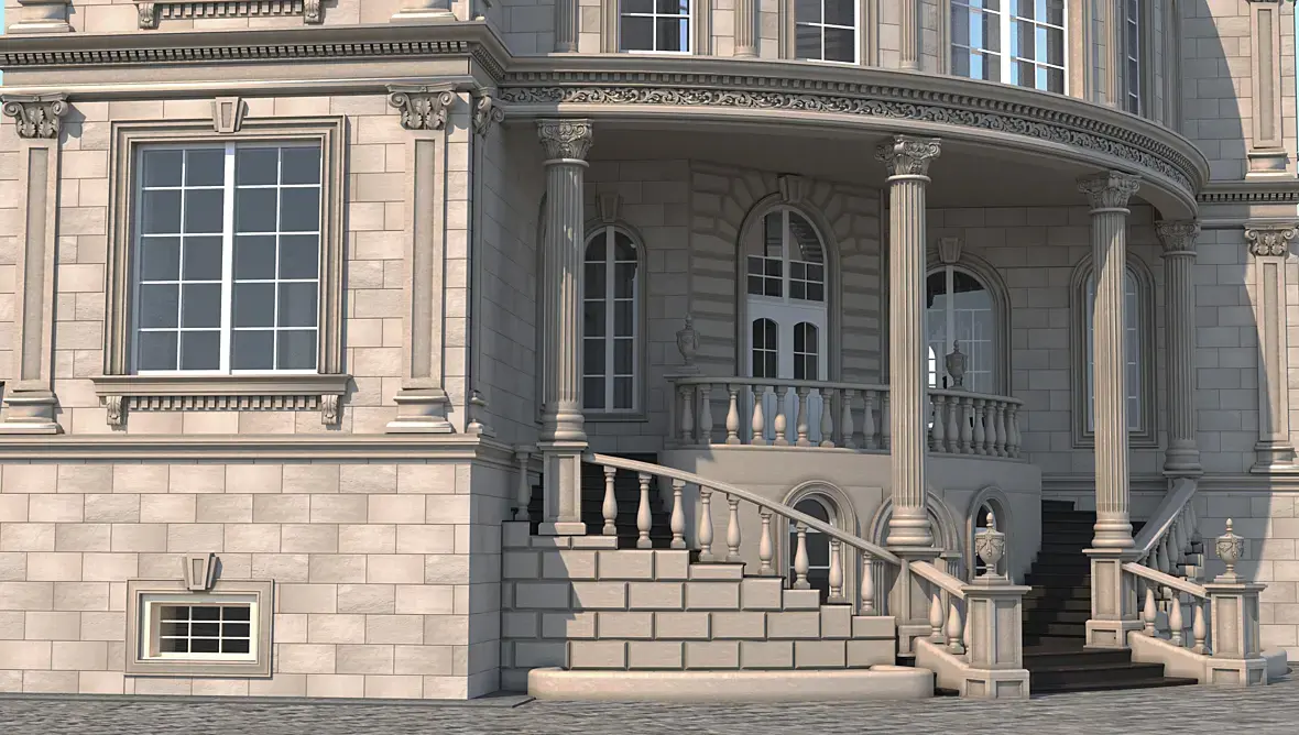скучновато по материалам. что стена, что лепнина, что карнизы... все почти в один цвет и тон. может балясины, капители, карнизы и наличники попробовать сделать из другого материала и цоколь сделать еще каким нибудь? Ну и не уверен что лестнице стоит давать такой же руст как и на углах. скорее уж как цоколь делать.