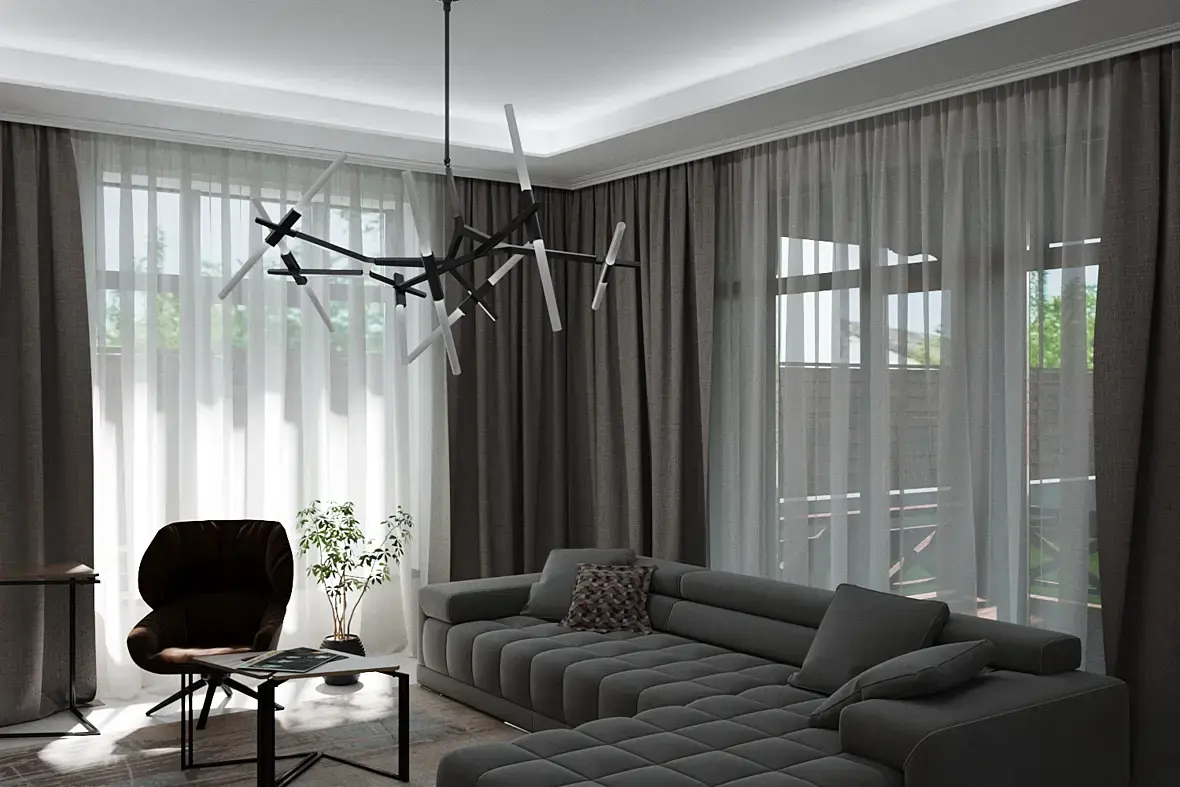 как-то зажато все, на камере можно уменьшить фокал ленз. Ракурс на диван - камеру чуть ниже бы(меньше потолка - больше дивана). Можно попробовать добавить красок: дневной свет - холодный, искусственный - теплый(также не стоит забывать что дневной свет намного ярче чем искусственный в реале). За окном слишком ядреный фон, текстура ткани на шторах великовата и стежки на диване лучше в тон сделать.