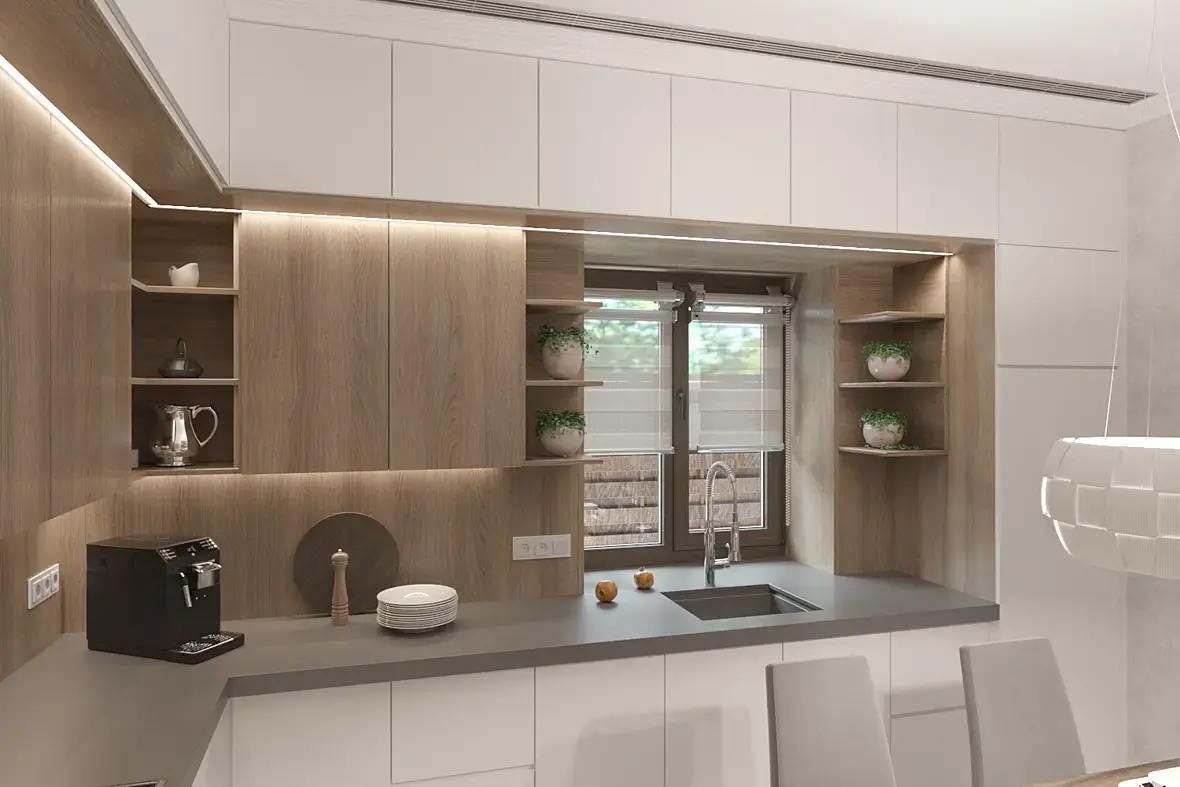 Но клиентам захотелось изменить стилистику кухни на более современную, освещение, розетки, выключатели потолок и пол уже все сделали... теперь кухня выглядит по другому.