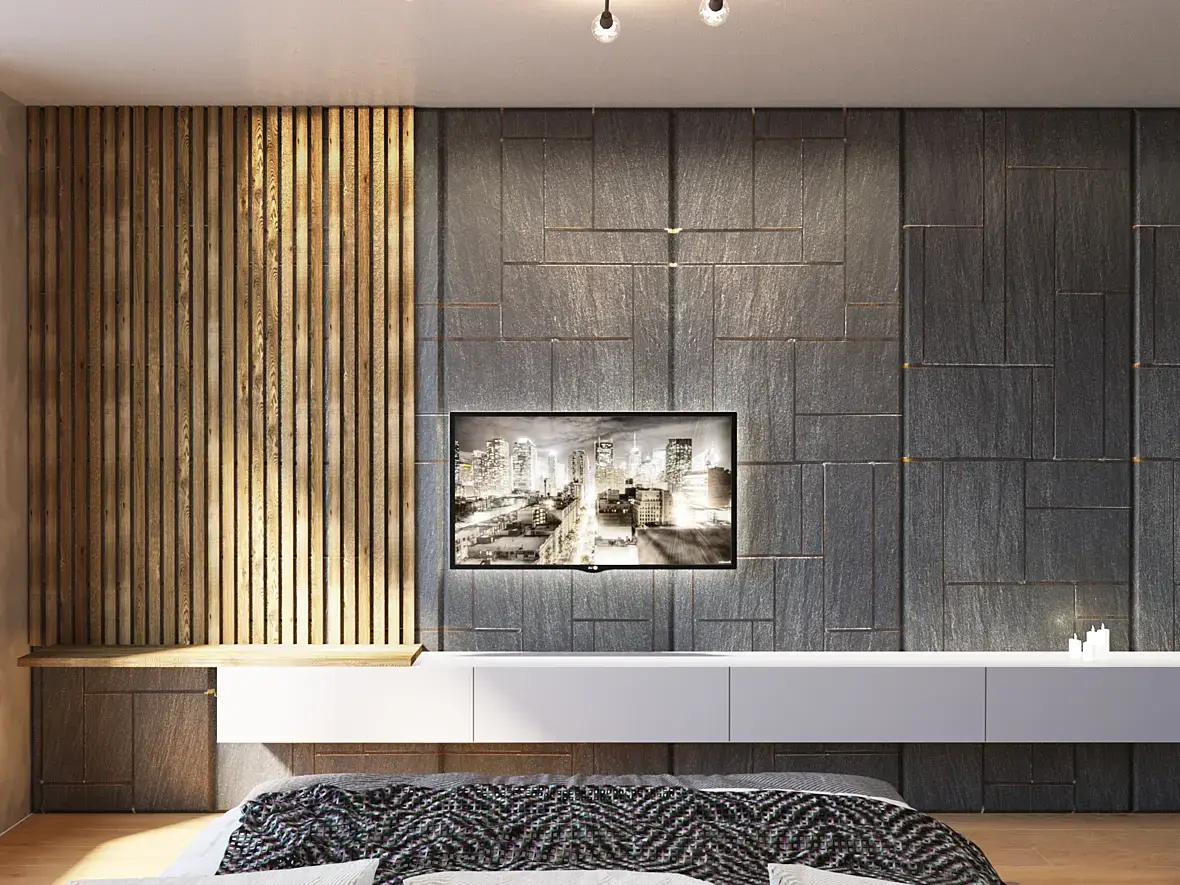По мне , слишком рыжее дерево, везде. И выглядит оно каким то необработанным (как деревяха не шлифованная ) Может убавить бамп, и добавить глосса. Очень бросается в глаза зеркальность панелей за тв. Постель не красивая. Текстура на царге кровати лежит не правильно. На двери нет ручки(больше деталей, розеточки над тумбой, выключатели при входе)Какой то декор. Что планируется на столешнице с рейками? возле тв. Если стол - слишком низко. Ковер выглядит очень странно и неестественно. Полка за кроватью-просто съедает место. Ну и лично по моим ощущениям синяя стена-слишком яркий открытый цвет, и не сочетается с синим на конструкции над изголовьем. Это так на вскидку