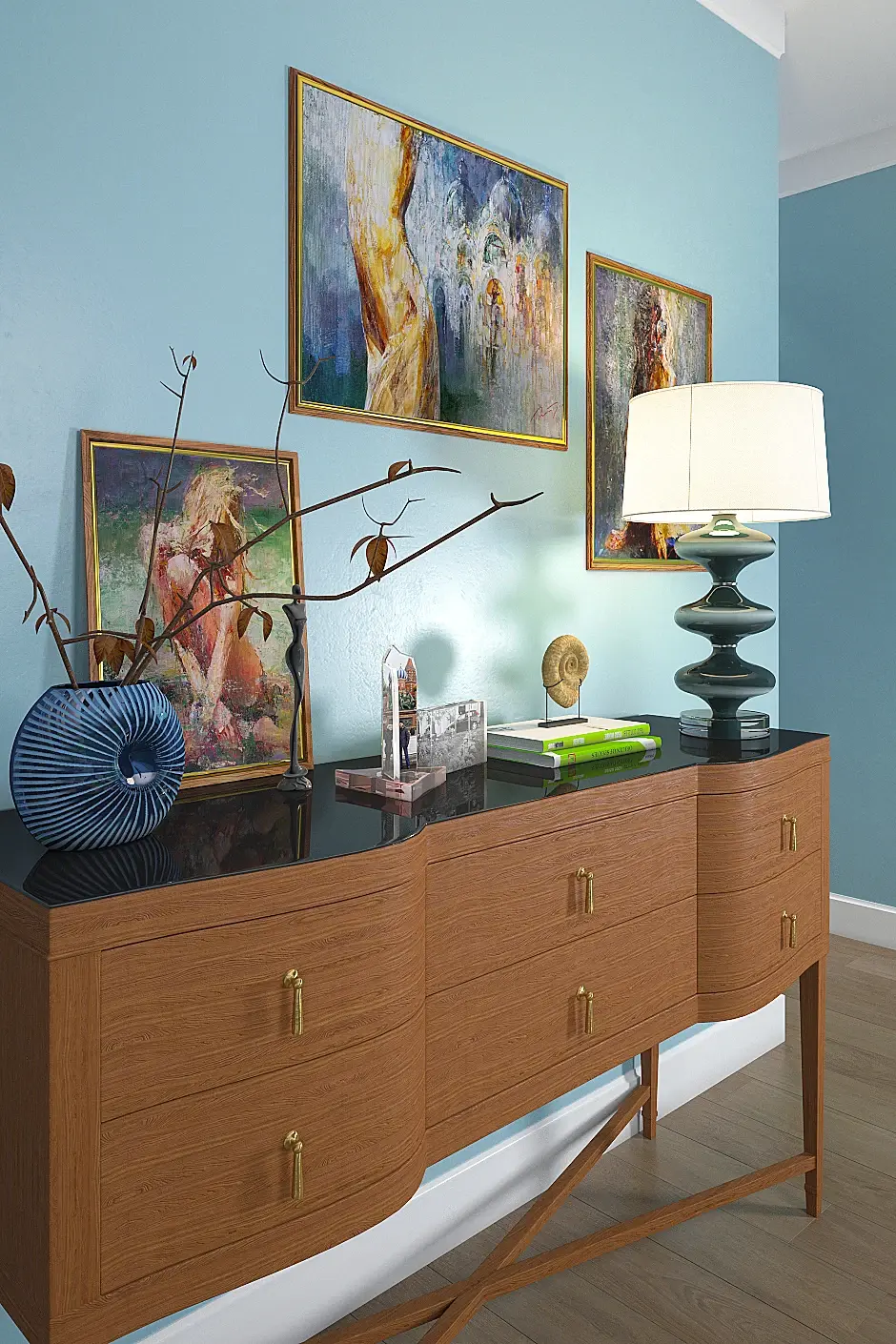 Третье. Я бы полностью заменила декор! сочетание модерна в мебели со средиземномрским декором и классическими багетами это масло масленное !! попробуте рамки более современные белые с белым фоном и те же рисунки например! ракушки и статуэтки лишние!! больше книг свечей возможно даже цветов!! в вазе!!