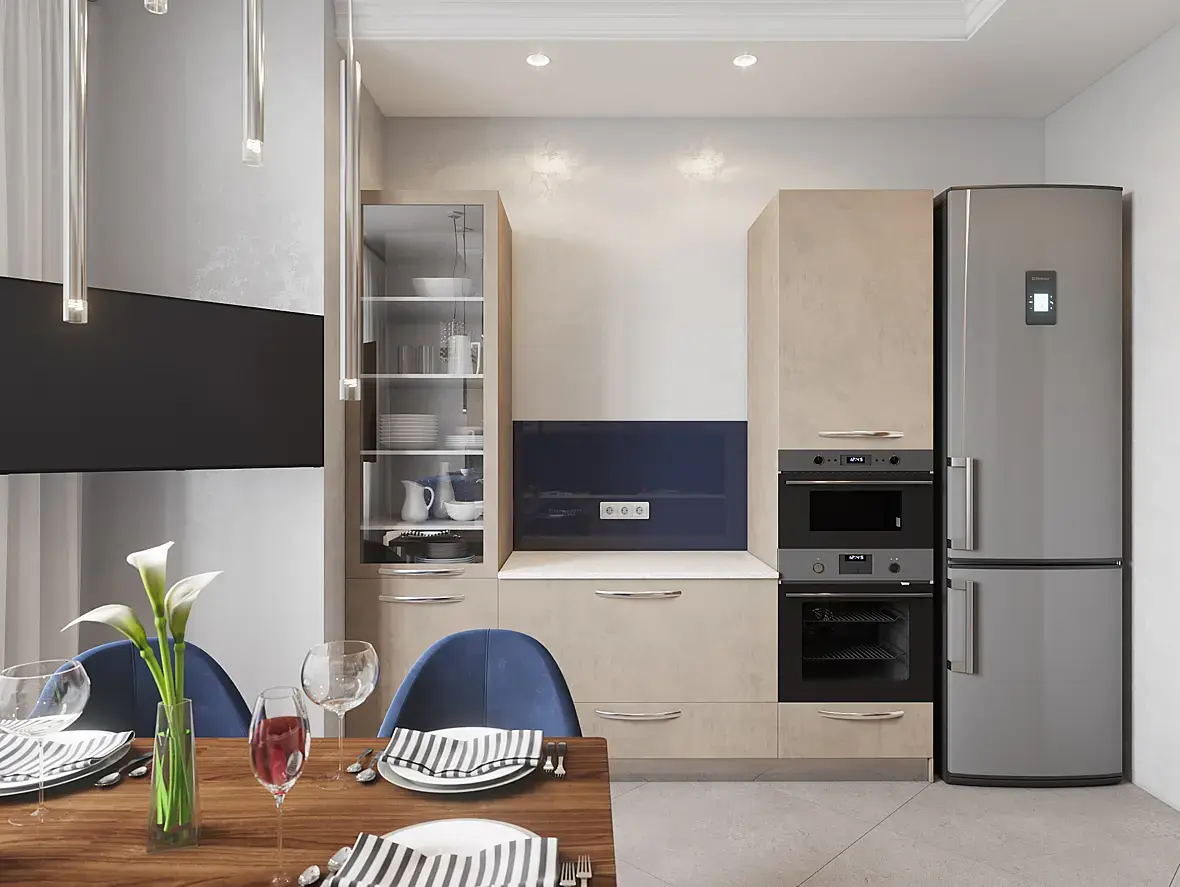 И убрал бы ужасную сервировку со стола. Оставил бы его пустым. И с рабочей поверхности кухни убрал бы всякую раскиданную мелочь.