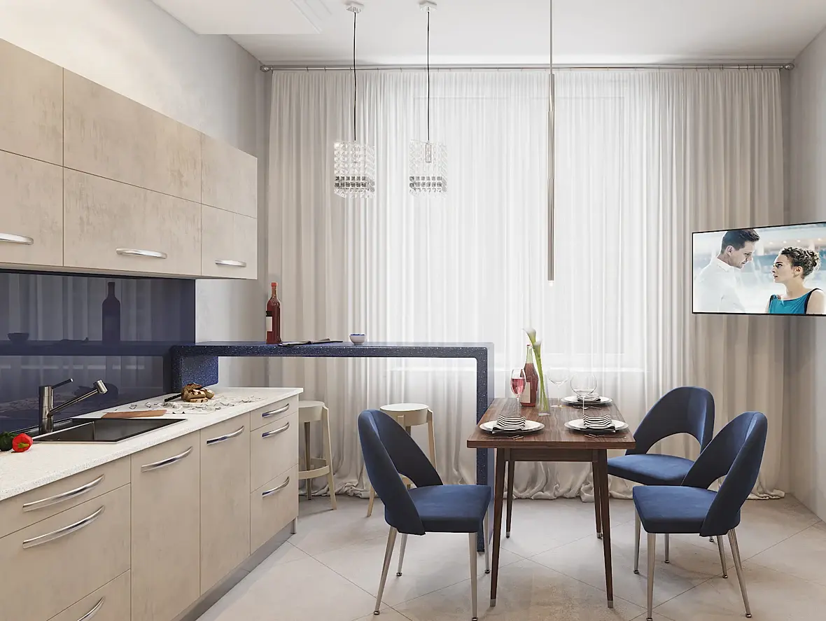 И убрал бы ужасную сервировку со стола. Оставил бы его пустым. И с рабочей поверхности кухни убрал бы всякую раскиданную мелочь.