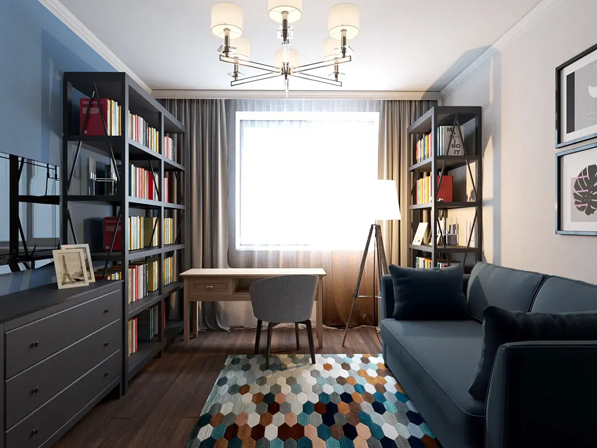 по дизайну: мебель немного спорит между собой, слишком много полок для книг, как по мне одной полки достаточно! если шкаф на первой картинке сделать белым станет еще светлее и он не будет казаться давящим! стол письменный я заменила бы на типичную парту из икеа!