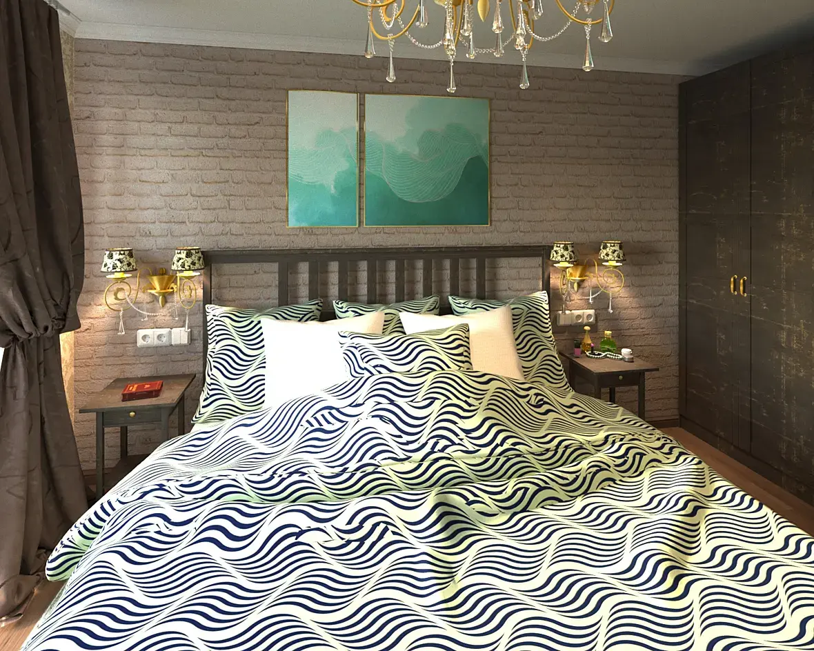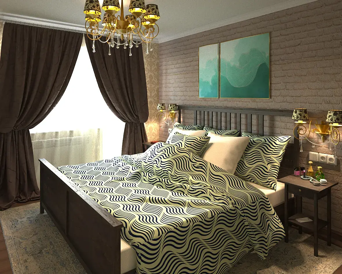 3. Далее это будут шейдеры. С деревом на спинке кровати и тумбах получилось у Вас неплохо, разве что не могу сказать такого про напольное покрытие. Уделяйте каждому материалу одинаковое количество времени и у Вас получится настраивать их более качественно. Что касается ткани, с ней однозначно нужно работать, в данном моменте не совсем понятно, что это ткань, выглядит конечно не хорошо, но обычно. Обратите обязательно на это внимание. Ну и насчёт кирпичной кладки. С ней однозначно нужно поработать, используйте "карты" высокого разрешения если Ваша система это позволяет и также, используйте параметр "displacement", он поможет Вам с имитировать реалистичную кирпичную кладку.