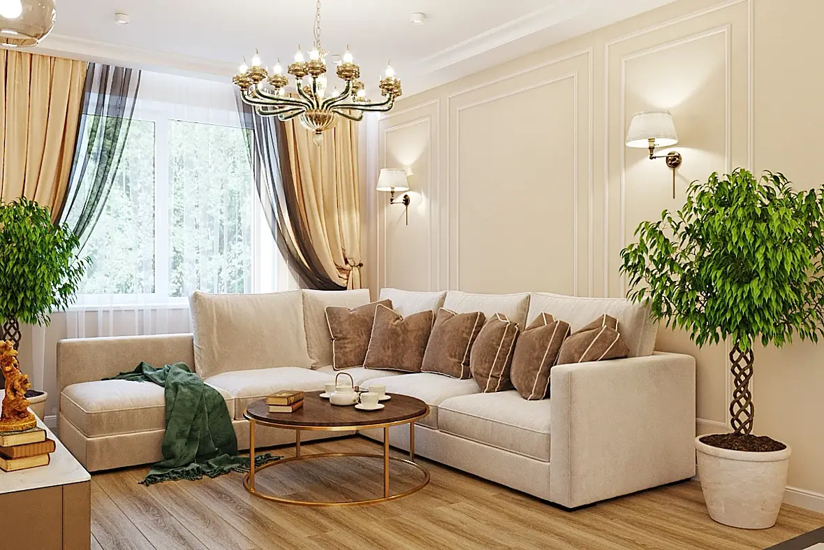 Диван не в стиль, кадр пошире, чтобы шторы полностью видны были. Люстра страшная, как волосы гидры, на сайте полно ОМ люстр красивых и по стилю больше подходящих. Двойные рамки на стенах одинаковой толщины безвкусно смотрятся.
