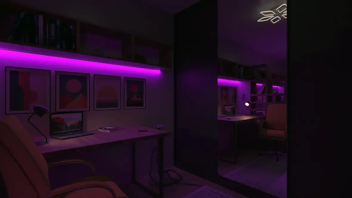 Автор делал наверное ощущение уютной тёмной пещерки. Сделать бы меняющиеся или переливающиеся радугой цвета, будет веселее и лучше осматриваться помещение. Всё что не может разглядеть человек, вызывает чувство страха у смотрящего. В фильмах ужасов это постоянно используется