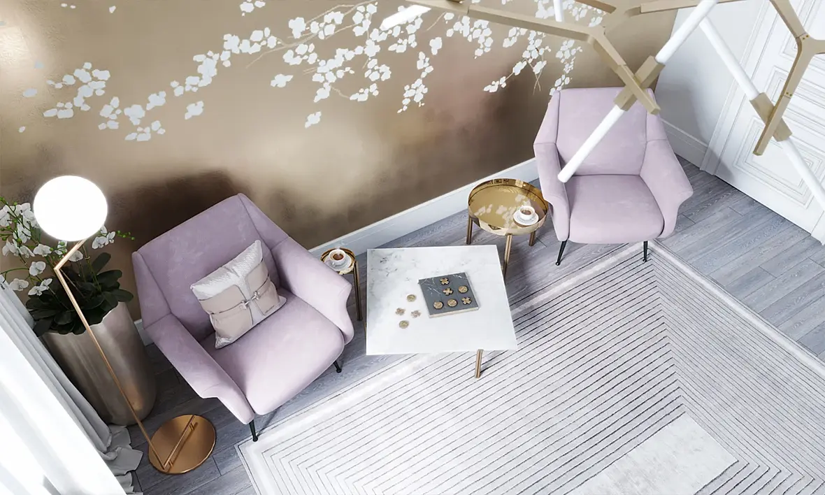 на последних двух ракурсах скорее всего проблема. Там перспектива искажена, из за этого кажется слишком пустой интерьер (попробуйте клипингом). Шторы очень странно смотрятся (модель искажена и материал на шторах нужно пересмотреть). В целом материалы подтянуть нужно: там золотая стена очень странная или там так и должно быть плиточными гранями отражение и шероховатость? Люстра пластиковая очень (можно с торшера к примеру золото использовать, и стекло исправить). Материал пола возможно, но это думаю не так критично (из за искжения кажется что линолеум постелили).