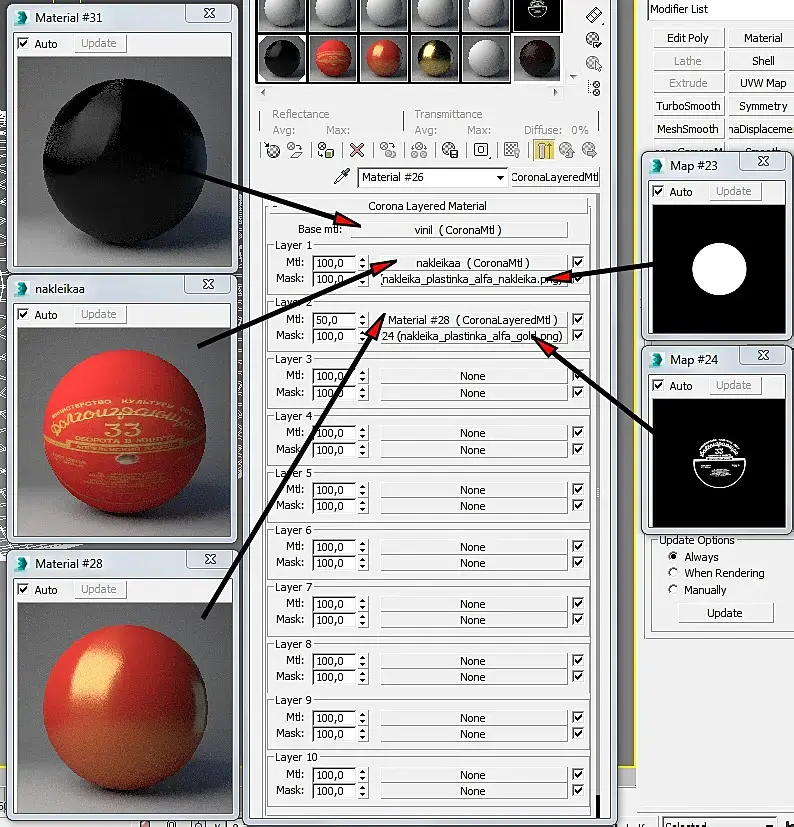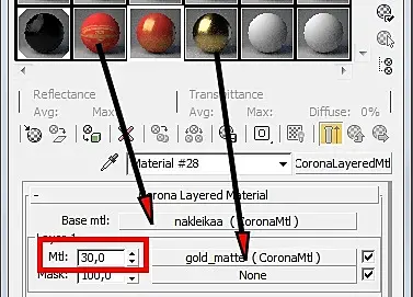 Теперь немного смешиваем материал нашей наклейки с обычным материалом шершавого золота. При помощи CoronaLayeredMtl и получаем новый материал для букв.