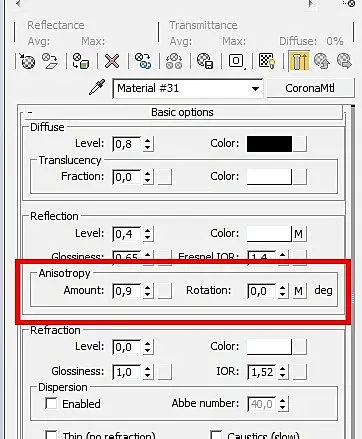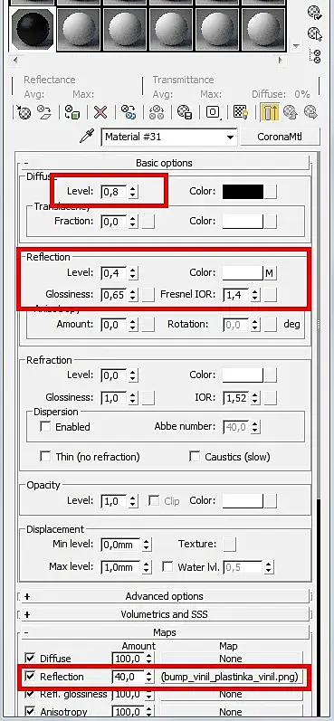 Далее берем обычный стандартный CoronaMtl диффуз выставляем полностью черный, level 0.8? настраиваем ему отражения как у обычного глянцевого пластика. В слот Reflection Color кидаем нашу карту бампа винила, не забыв внутри карты включить галочку инверт.
