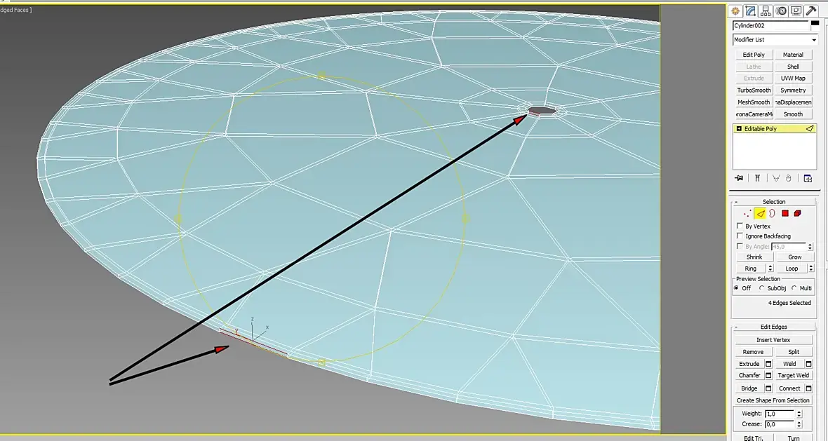 Выделяем плоскость и нажимаем inset для последующего уменьшения граней двигаясь к отверстию в пластинке. Делаем это несколько раз, пока не дойдем до отверстия посередине пластинки. Количество граней при этом уменьшаем до 8 ми.