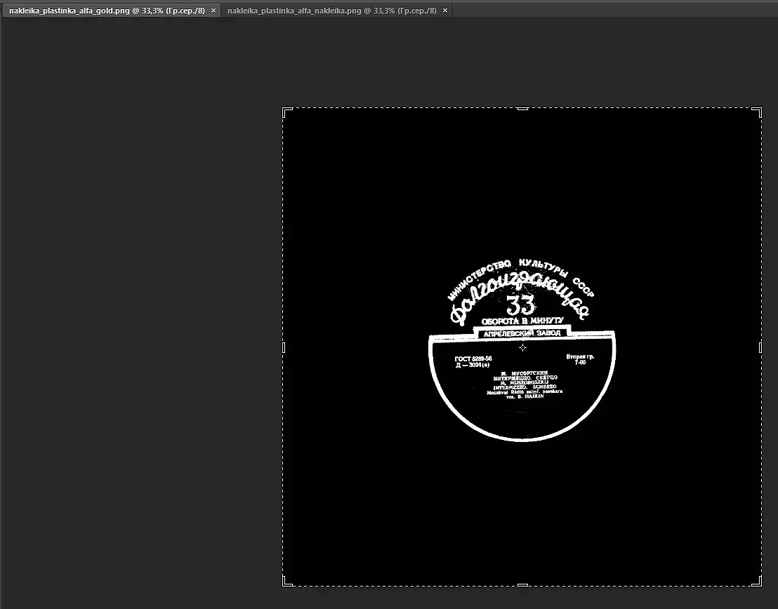 Пришло время готовить текстуры. Для начала я приготовил два альфа канала один для самой наклейки на виниле, второй для золотых букв. Выглядят они так.