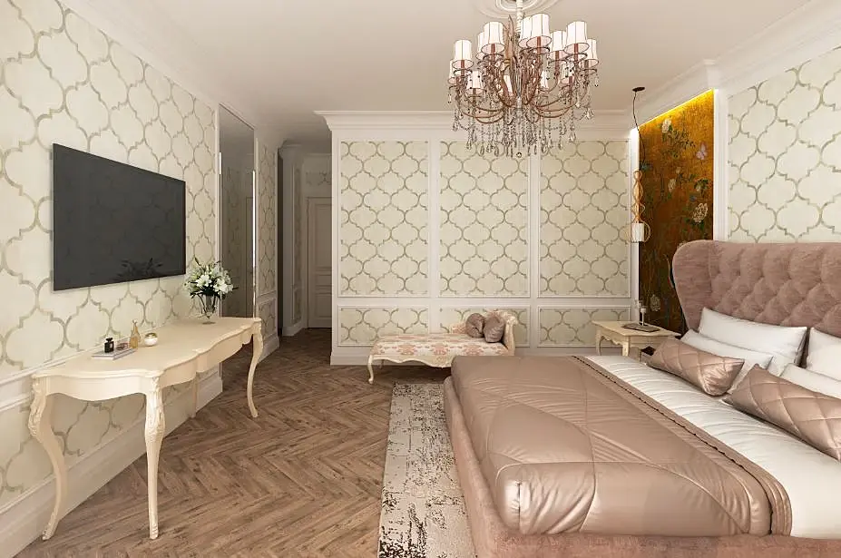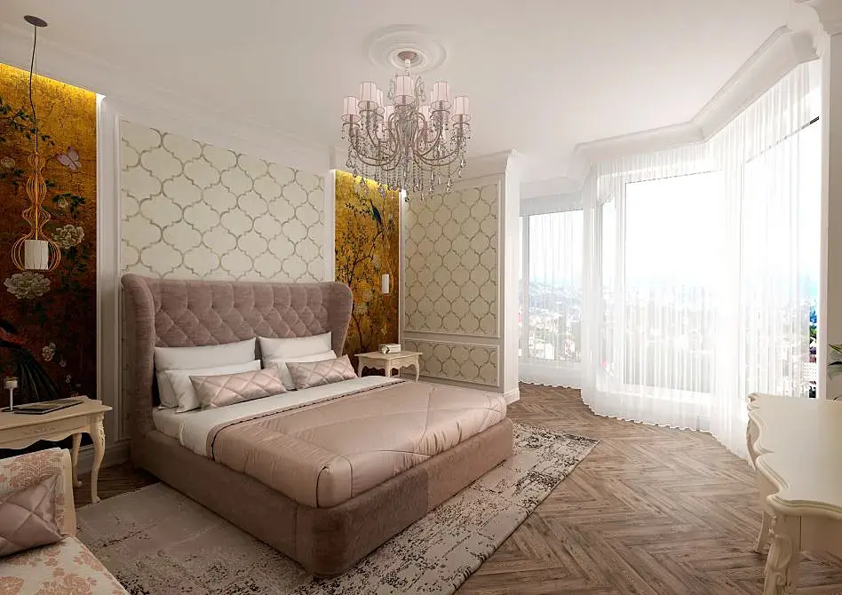 освещение. очень тускло, невыразительно, кажется что воздуха нехватает в комнате. есть артефакты на полу, светильниках и изголовье. материалы невыразительные. люстру вообще лучше не включать при дневном освещении. модель штор изящнее возьмите.