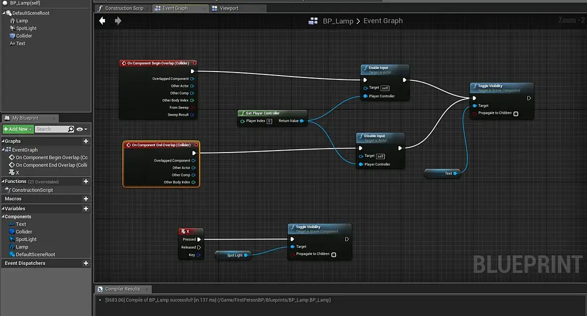 Получилось, только надпись Press X видна в момент пересечения коллайдера лампы. А должна быть видна постоянно, когда я нахожусь внутри. И материал торшер не видит
