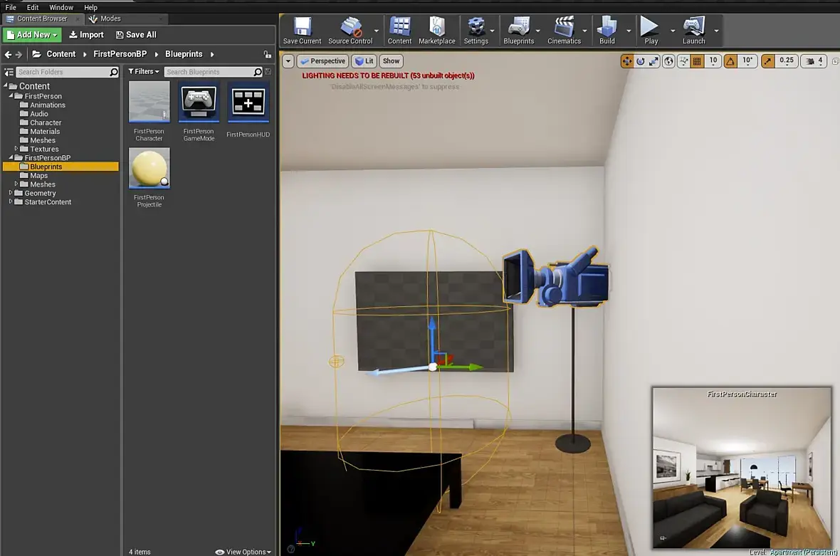 Теперь настраиваю интерактивность сцены с помощъю блюпринтов.
