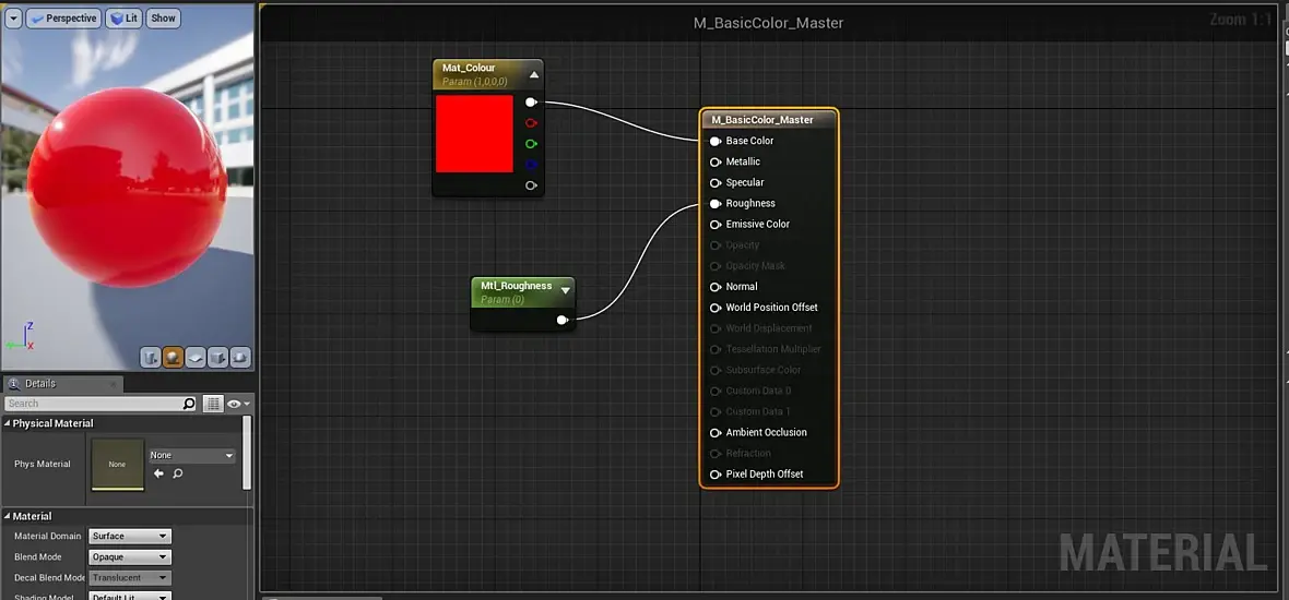 Простой цвет, родительский материал В слотах Base Colour и Roughness ноды Vector Parameter и Scalar Parameter соответственно. Эти параметры дают возможность внести изменения в инстансы материалов Можно подключить также Constant3vector и Constant. Эти – нет