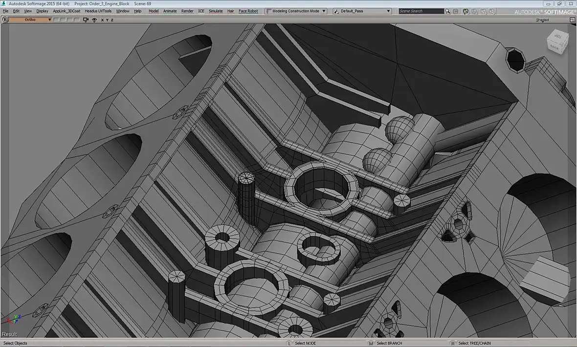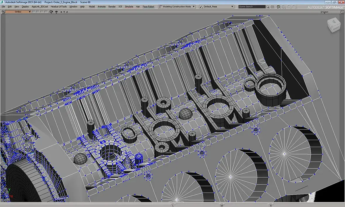 Я б общий полигонаж исходной сетки снижал. Все же постараться чтобы самые большие дырки (цилиндры) были восьмиугольниками в исходнике а остальные 4 или на край 6-ти. И доныщки в них не нужны понятно. И в идеале бы сделать "как в жизни" - чтоб в блоке гильзы стояли.