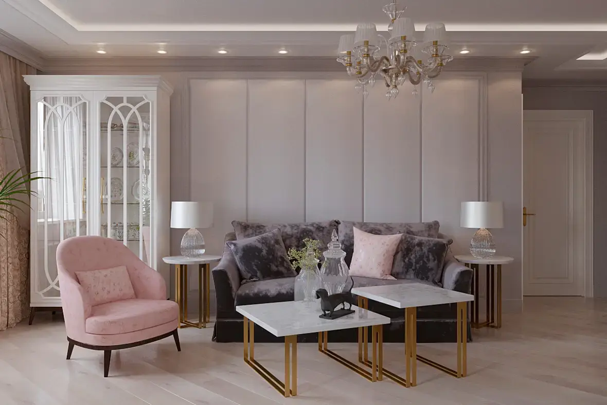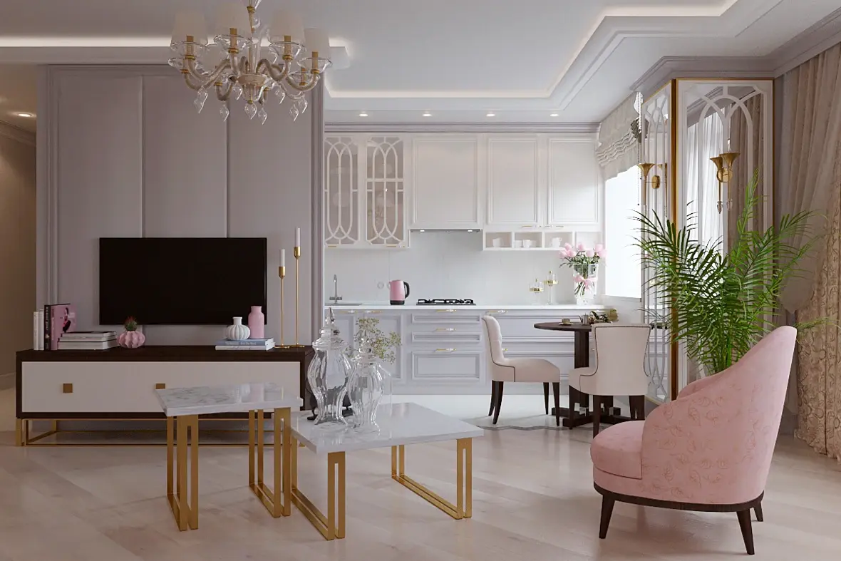 хочется отключить все точечное освещение и подать картинку с акцентным освещением, зажечь напрмер настольные лампы теплым светом, настроить текстуру дивана и кресла получше, возле тв тоже разместить каки6е-то светильники и их повключать, подсветку под потолком тоже теплее сделать или зажечь бра на стенах у окна
