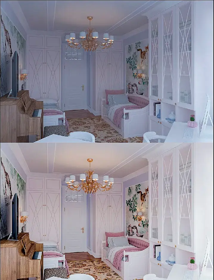 Оцените работу по визуализации комнаты для двух девочек. Как можно улучшить работу? Меня беспокоит освещение, ну и вообще может что-то я не замечаю из недоработок. Буду очень признательна за конструктивную критику.