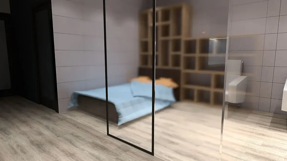 "В этом проекте для отделки стен был выбран керамогранит с целью создания ощущения холодности. Так же была использована современная мебель из металла и пластика. Спальня и гостиная разграничены перегородкой из оргстекла. Оно позволяет разделить пространство, но в тоже время делает его более просторным."