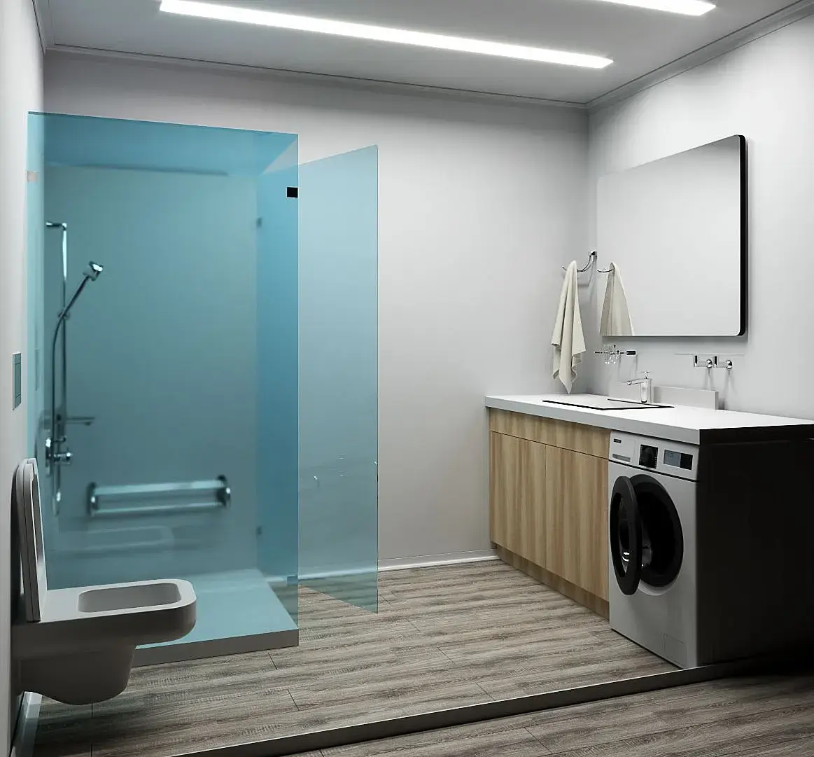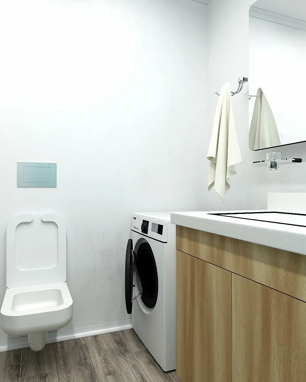 А что моделек получше не было? Стиралка, душевой, унитаза, раковины, смесителей? Полотенца сушить будете в воздухе, или где то есть полотенцесушитель?? Ну тд, стаканчики, мыльницы....это так, к общему наполнению. Ну и в ванне что за стена? Краска, белила-цинковые, водостойкие? Как в 60-х в совдепе? Что нет плитки никакой? И что за ступенька? Чтоб вода из ванной лилась во всю квартиру?