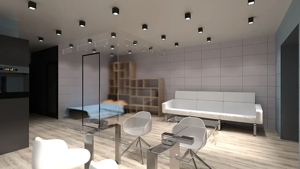 "В этом проекте для отделки стен был выбран керамогранит с целью создания ощущения холодности. Так же была использована современная мебель из металла и пластика. Спальня и гостиная разграничены перегородкой из оргстекла. Оно позволяет разделить пространство, но в тоже время делает его более просторным."