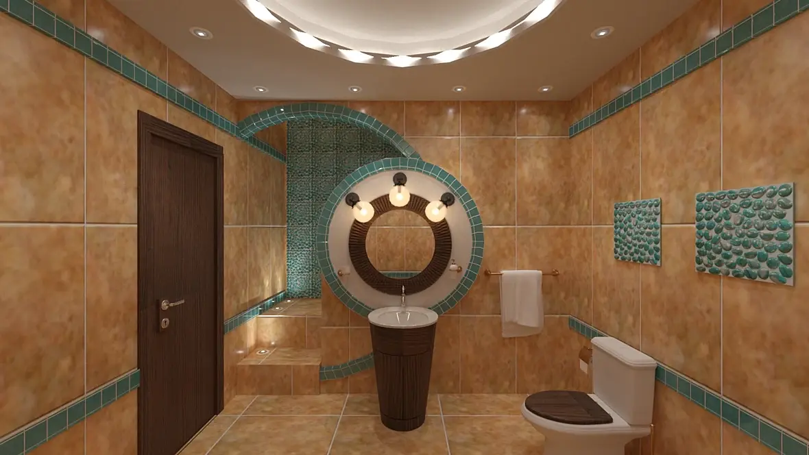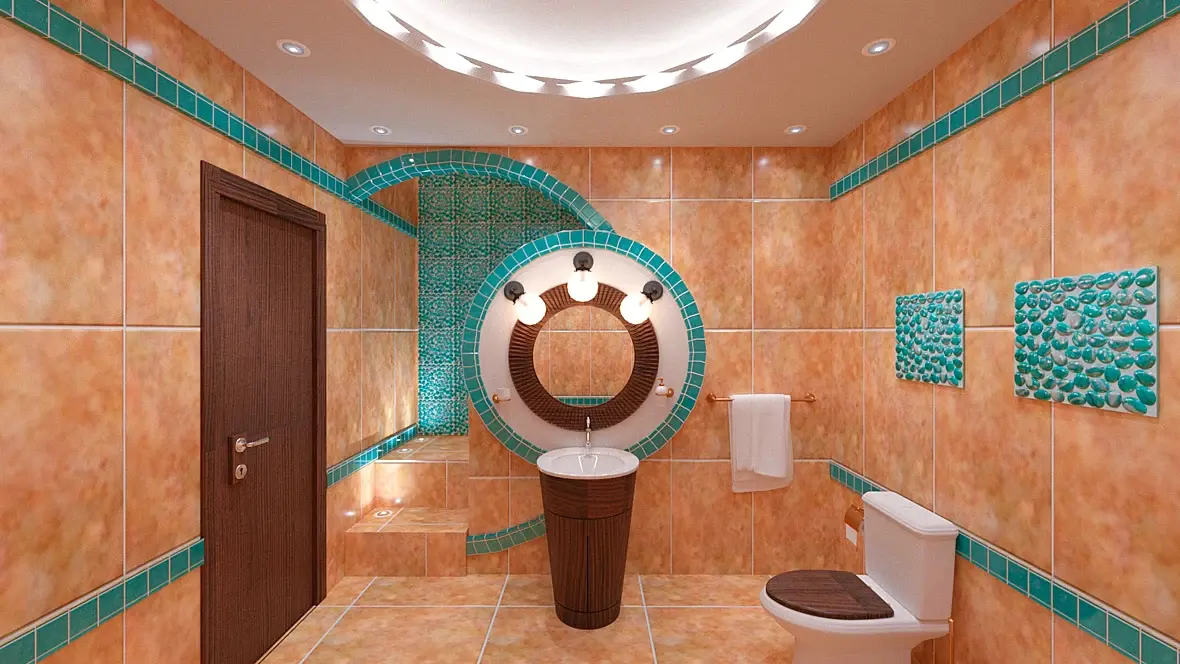 Ну во-первых, темно. Источники света есть, а света нет. посмотрите уроки по  правильной настройке искусственного освещения, посмотрите фотографии, как распространяется и отражается свет в ванных комнатах.