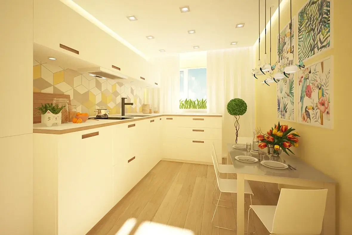 Во-первых источники света лучше ставить на нейтральные цвета, выше 5100... у вас по ощущениям 4100. Потолок должен быть белый\серый но не в цвет лимонада. Во-вторых Ставьте камеру ровно, косые камеры подходят для предметного виза и то если умеешь. Научитесь пользоваться " Miscellaneous" в настройках камеры, у Вас изображения не охватывают всего и просто обрезают мебель. Смотрите видео-уроки по освещению и камере. Это для начала.
