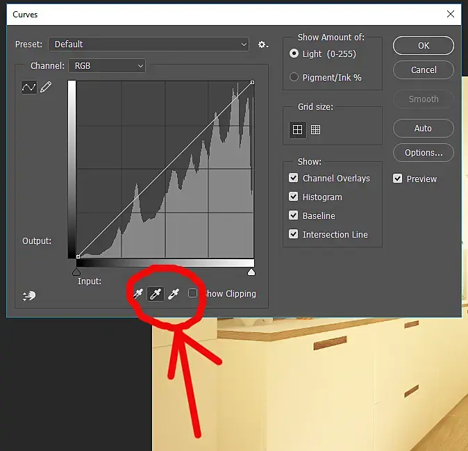 Пипеткой берём цвет заливки, что получилась - он висит теперь в памяти. Жмём ctrl+z чтоб снять фильтр, жмём ctrl+m чтоб вызвать курвы, жмём среднюю пипетку - и выбираем наш ранее выделенный цвет (они висит внизу в палитре)
