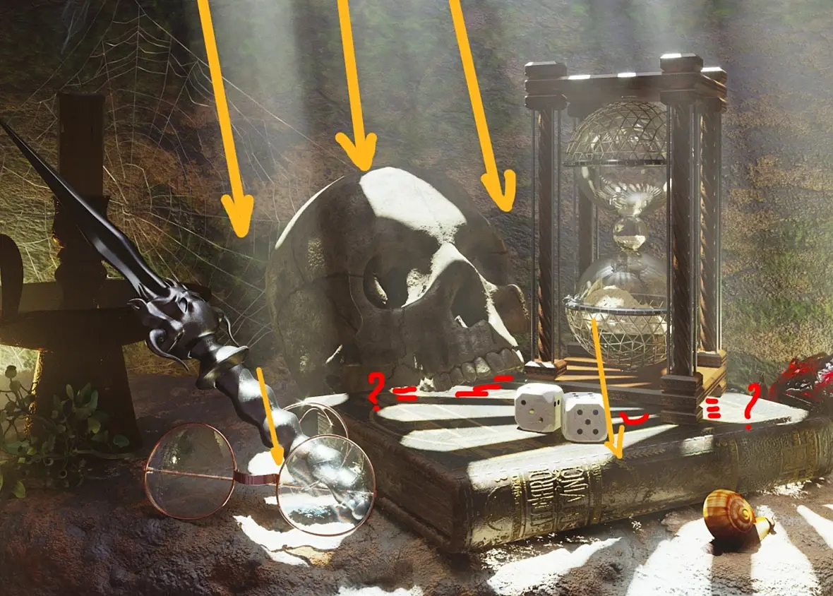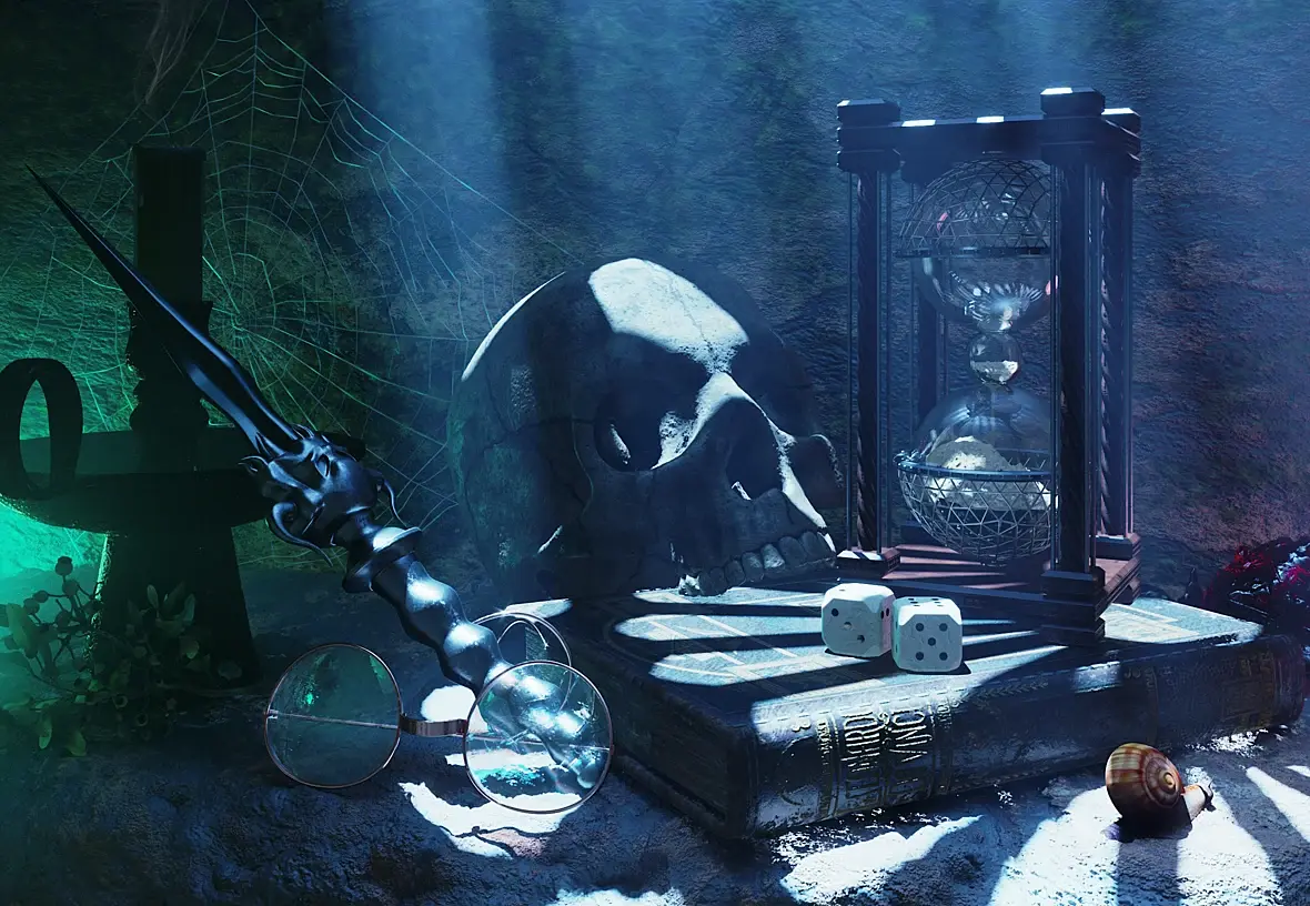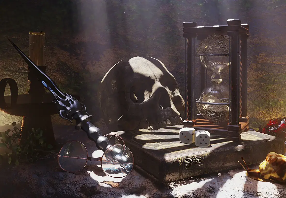 Может пару тройку самоцветов добавить... и оживить золотую улитку! Может не хватает немного self illumination хрусталя с песком.. Хрусталь - преломление 2.0 . Свечку что ли зажечь..или же потушить с дымком. нет пыли.. да точно.. пыль была бы актуальна... и красную лампочку в череп - самоцвет самосветик!