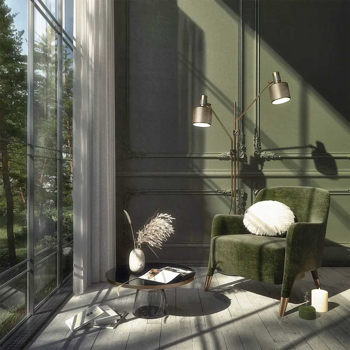 Для галереи - посадите на кресло чёрного кота, со смотрящими на зрителя жёлто-зелёными глазами с узкими зрачками.