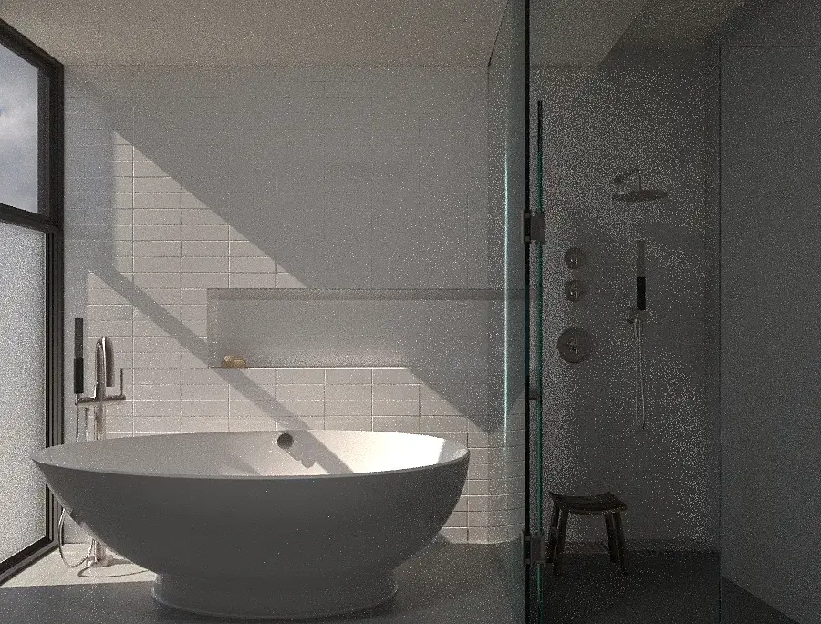 я бы не делал стекло матовым, тк лежа в ванной иногда хочется полюбоваться окружением, тем более панорамное окно. я бы предусмотрел жалюзитак же поиграй с освещением, фейкани, залей больше светом комнату, как то темновато вдалеке.еще бы чть расшил потолок и плитку (сделал бы шовчик небольшой) чтобы подчеркнуть геометрию.ну и солнце покрути, вся картинка темная какая то.
