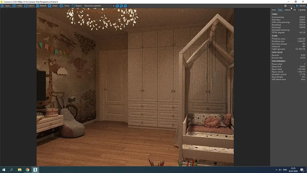 Ну и ракурс еще можно подрихтовать - сейчас искажена кроватка и неудачно обрезана люстра.