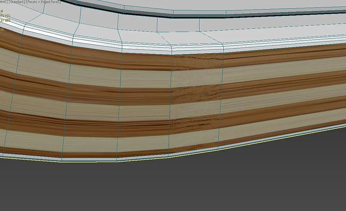 Да с фаской все впорядке. Ну можно конечно поудалять несколько витков ребер, но не принципиально. Я говорю про саму верхнюю плоскость столешницы! Большая круглая грань одним полигоном! Она должна быть так же разбита на мелкие прямоугольники или треугольники.