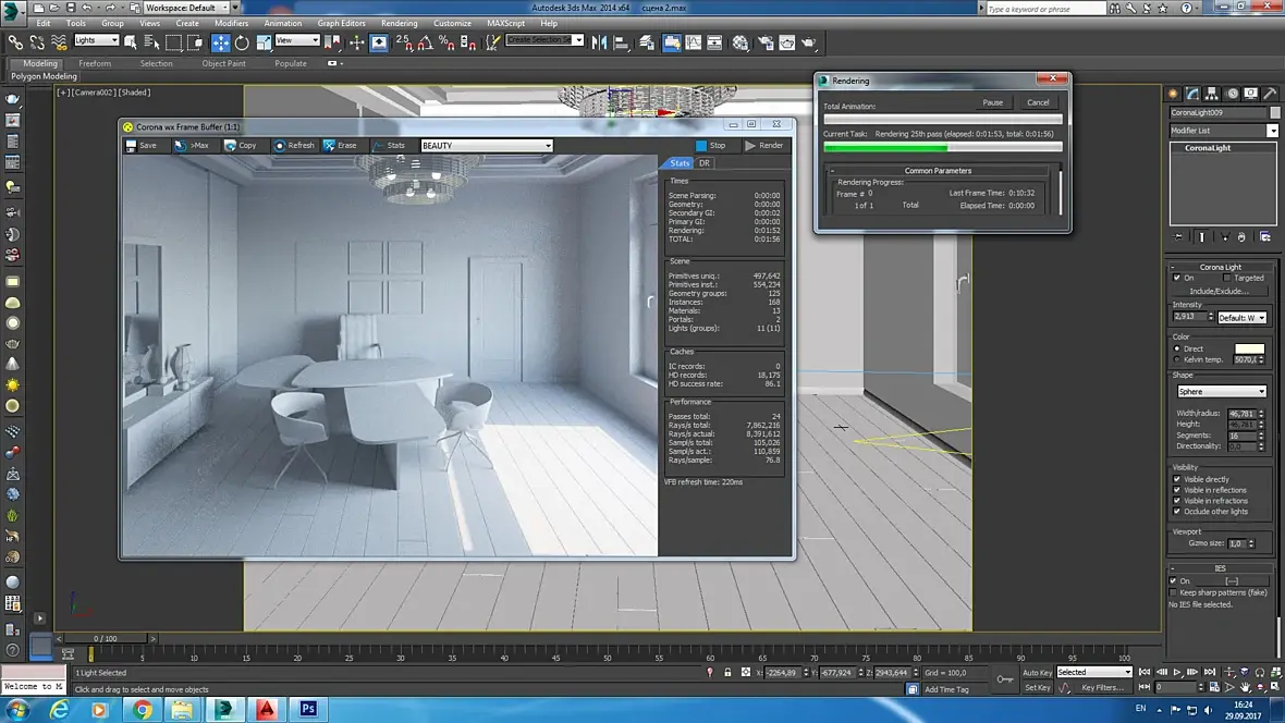 Если хочется - можете еще поиграть со светом из окна. Но в принципе сейчас уже вполне себе - Ок. Можно переходить к настройкам материалов. А свет подергать потом уже по месту. С другой стороны если вы хотите, что бы горел верхний свет, то его имеет смысл включить сейчас. И начать подкручивать его температуру и яркость.