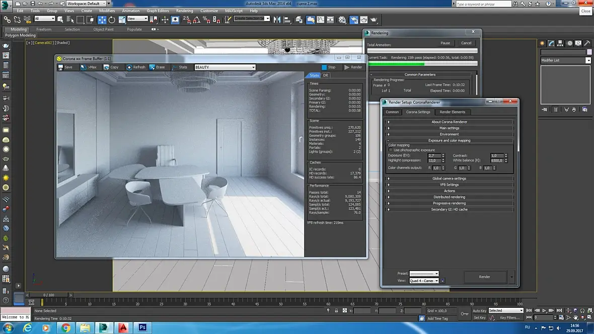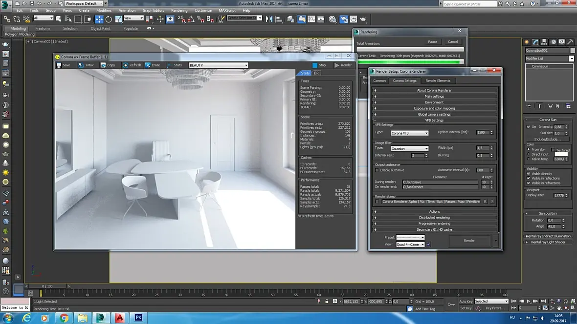Из источников стоит HDR, Сorona sun и Оmni, без последнего сцена была совсем темная. Еще есть светящиеся материалы на потолке. Не понимаю ваше предложение,цитата: "Включите MtlOverride и отренедерите сцену в сермате". Видимо не продвинута совсем еще. Я так с ютуба и настраивала...на окне стоит портал...Буду рада помощи и совету(