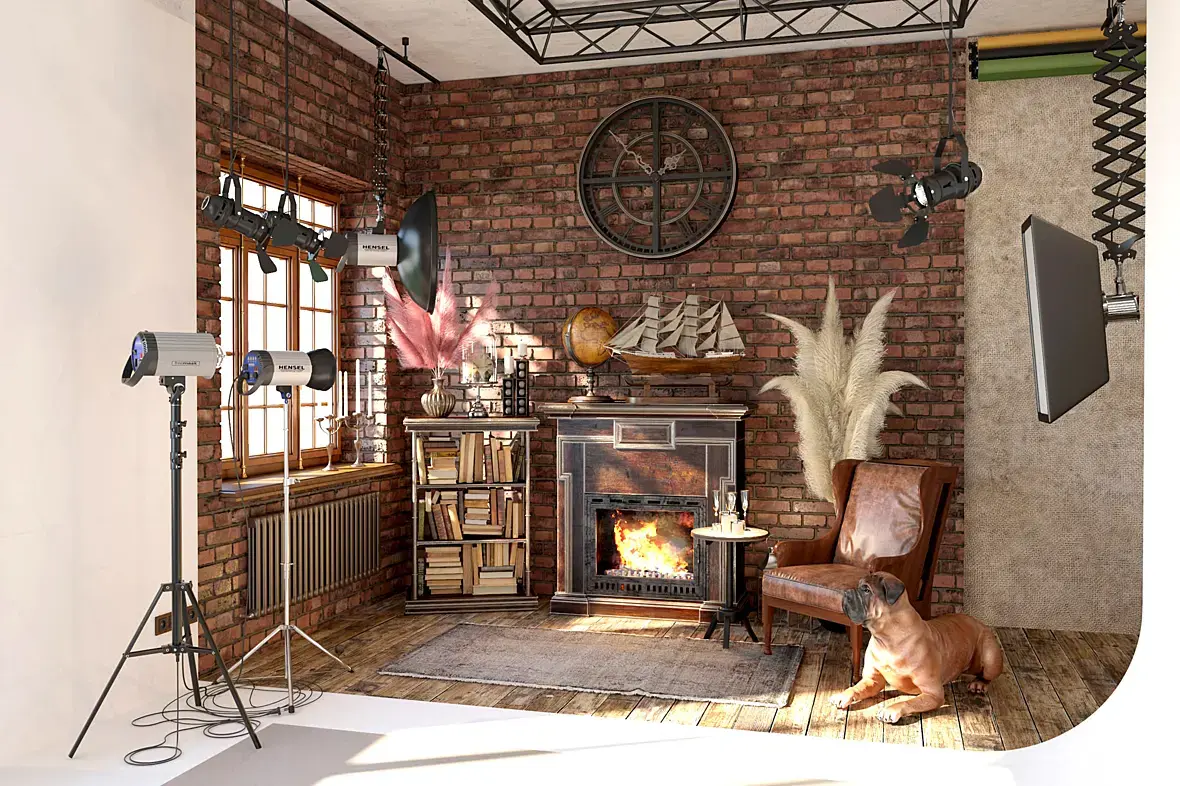 1-нереалистичный блик 2-пересветленный мат камина, 3-зажаренный пол, 4-жареная собака, 5-дерьмантин а не кожа, 6 - дизайн обоев не очень. (+ розовый отсвет камина на стене слева)