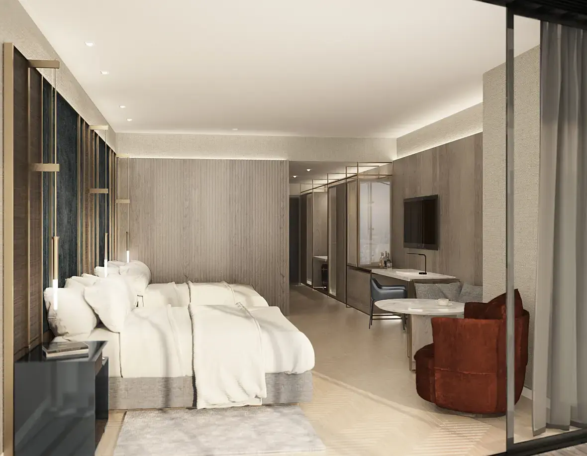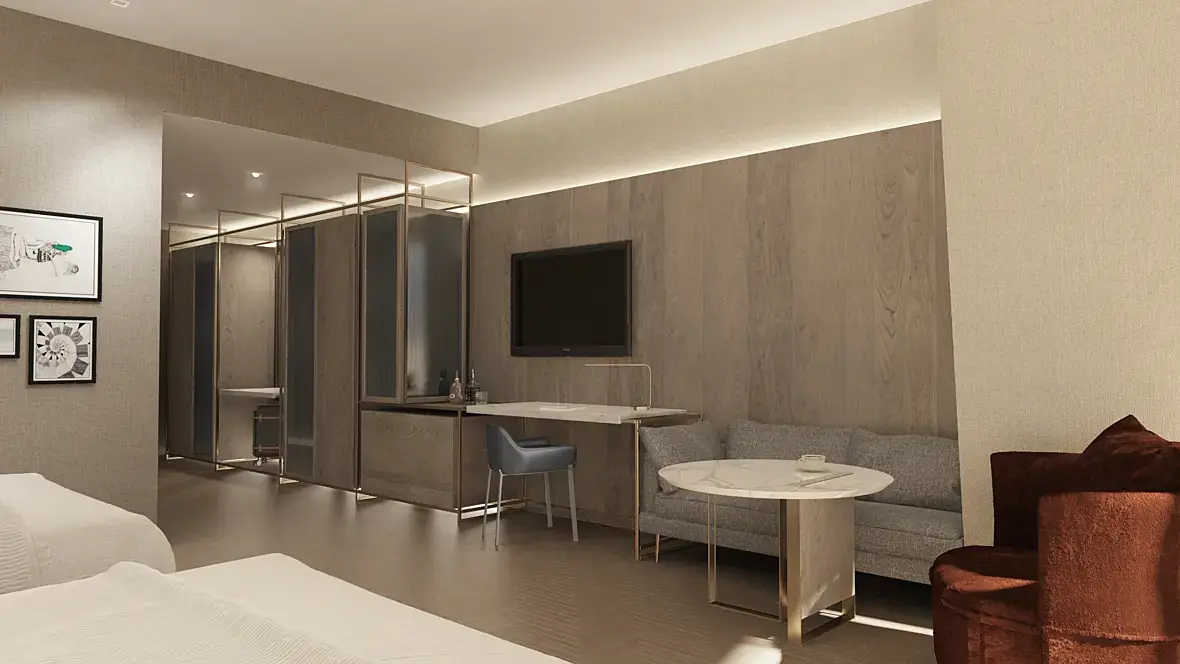 А в кинг рум окно не ближе к кровати, чем в дабл? Можно специально пустить дорожку света на кровать, тогда первый план, более светлый, выделит темный задник. Еще я, если от вирей (или корона) скай света не достаточно, ставлю фейковый светильник-плейн перед шторами. У Вас на рендере бэк за окном нормальной яркости, свет на полу есть, но общее впечатление, что комната освещена плохо. Еще бы посоветовала применить рэй свич материал для пола и стен, Вы избавитесь от серо-бежевого оттенка на потолке и других поверхностях, которые должны быть белыми и в общем картинка станет чище и ярче. А в общем - нормальный гостиничный интерьер.