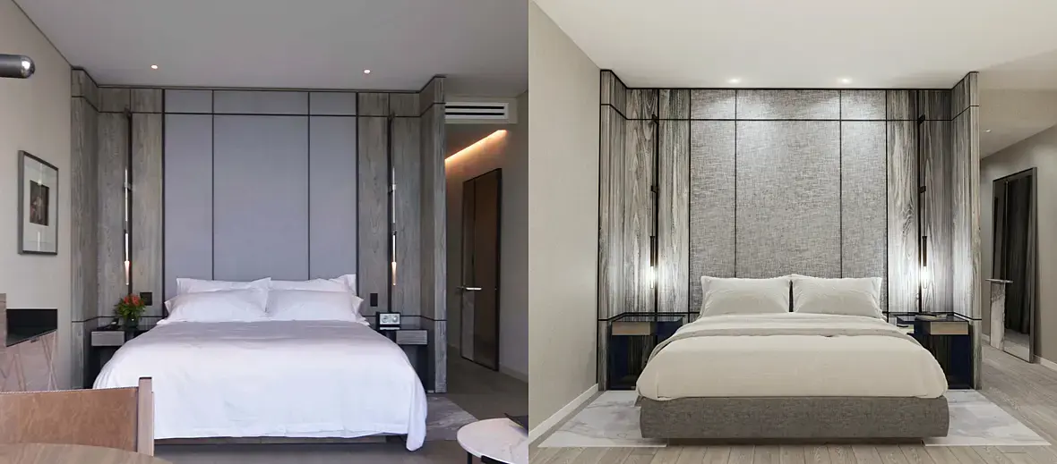 Фото и рендер, прошлого года. Уже построили один из вариантовВот мы разрабатываем текстуру до идеала, а на самом деле и не видать так этот пол со всеми его венками и отблесками. Или же текстура на изголовье кровати. В живую да, видно глазу, но не так отчетливо. Вопрос у меня все светильники настроены по температуре. Холодному оттенку, солнце, два плайна перед окном, HDRI города днём. Почему все так желтит на рендере?