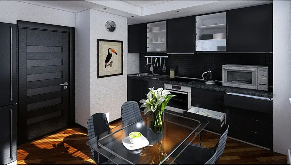 По дизайну опять же выскажу своё мнение. Трубы легко прячутся в стену, для этого просто надо вызвать сантехника из жэка, немного раздолбать пол с потолком(в вашем случае потолок не надо, т.к. там гипсокартон), приварить отвод с поворотом, проштробить стену и спрятать туда трубу. Делов на 1 день с штукатуркой. Опять же, кухня абсолютно неюзабельна. Надо менять её конфигурацию, причем кардинально. То, что строили в советское время редко подходит под современные реалии. А делать проект без учета удобства использования и в таком виде, как оно было до этого смысла нет никакого. Посмотрите как реализованы кухни в маленьких скандинавских квартирах. Там всё в основном по-человечески и для людей. Всегда можно сделать минимальную перепланировку, просто подумать над расположением мебели, над тем, как и куда будут открываться шкафы, пройдёт ли человек в каком-то месте или же ему будет узко и неудобно. Про опущенный потолок тоже много чего можно написать. У нас в типовых хрущевках потолки итак ниже некуда, а вы его ещё опускаете. Точки в потолке тоже выглядят старо и безвкусно, сейчас много достойных производителей с хорошим дизайном, а не вот это вот из 90х. Ну и не понимаю смысла делать типичную реальную кухню в реальном доме. Если проект коммерческий, то это провал. Если для себя, для портфолио и с целью научиться чему-либо, то тоже провал, т.к. на такую работу ни один серьезный заказчик не обратит внимание, а лишь наоборот.
