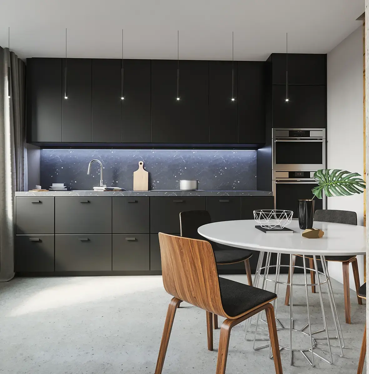 ну тут и не скажешь что эти два ракурса с одной комнаты. Еще композиция сырая, вроде бы минимализм, но не доделаный. также кухня, зачем доску ближе к раковине? Да на кухонной столешнице детали как будто с другого спектакля. В вообщем нет целостности картинки, маты, модели допилены хорошо, но с деталями, ощущение будто просто быстро по скидывали что было и все. Ракурсы непонятные чуть чуть, либо информативные, либо художественные? определитесь с ними. Работа выглядит сырой, даже бэк за окном не стоит, что аж ХДР палится сильно. Где кресло, не понятно что именно хотели показать, если мебель то весь фон сьеден, если уголок, то перспектива искажена. ну как то так.