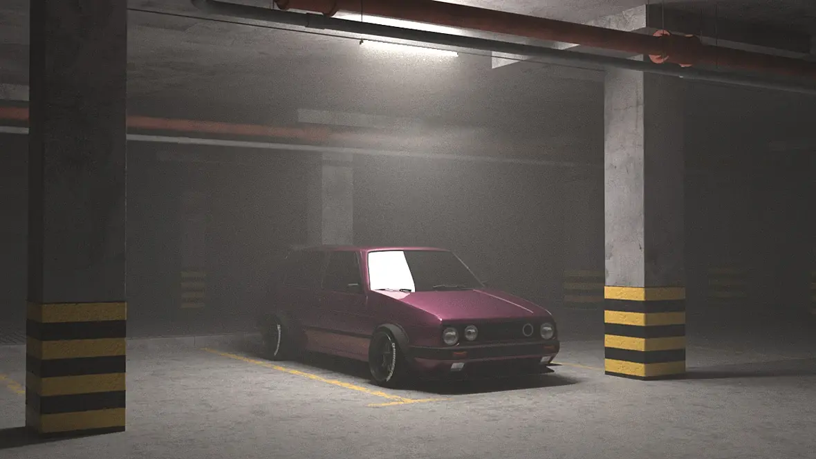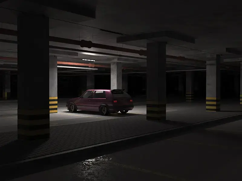 а что вы хотите в этой работе больше показать - сам паркинг или машину? потому что если машину - действительно нужно при выборе ракурсов больше её на кадре тогда и сделать на ней главный акцент. сейчас она как бы теряется и картинка "пустая" выходит